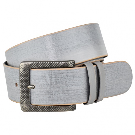 Handgemachter Gürtel in hellgrau. Silbergraue Schliesse mit geprägtem Muster und naturbelassenenKanten. Riemen aus vegetabil gegerbtem Rinderleder. Taillierter SchnittAbmessung: Breite 4 cm x 107 cm Länge 85