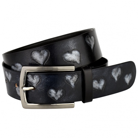 Handgemachter Gürtel mit punzierten weissen Herzen. Edle eloxierte SchliesseRiemen aus vegetabil gegerbtem Büffelleder. Taillierter SchnittAbmessung: Breite 3,5cm x 115 cm