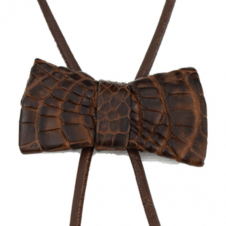 In aufwendiger Handarbeit gefertigte Lederhalskette mit SchleifeAus Kaimanleder. Abmessung: Gesamtlänge 44cm bis Schleife 38cm Schleifenbreite 6cm